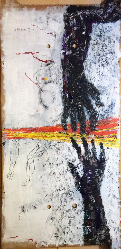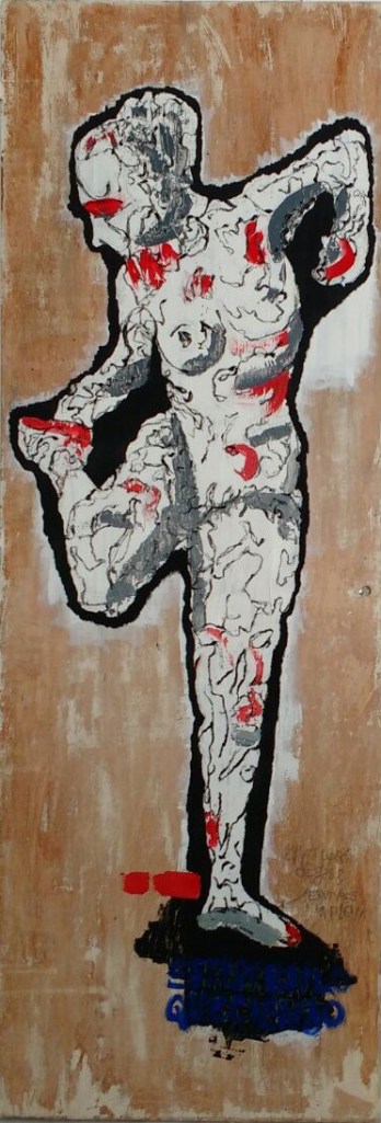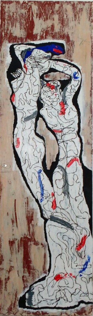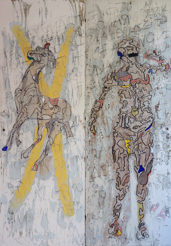 The day after the elections the very efficient cleaning device of the city hall removed all the propaganda supports, preventing the continuation of the work on that series. I soon discovered that the apartment renovations in my neighborhood were supplying me with other types of supports, wooden doors in different states of conservation, but always old and repainted. Since they were almost always white, at first I tried to strip the backgrounds, leaving the white paints/varnishes as a primer for my interventions, which were extensions of drawings on the vigorous sculptures by Degas or Rodin, versioned as a Hourloupe by Dubuffet. On the way I discovered that some of the doors I had collected were old, and were covered by numerous layers of paint in different colors, so I abandoned the heat gun and used blades to scrape each layer (as I had learned with Manuel Serrano, a Mexican master restorer) with patience, to use those shades as my own palette. Then I completed the set with crayons or translucent paints, so that I would always be able to see the intrinsics of these doors.