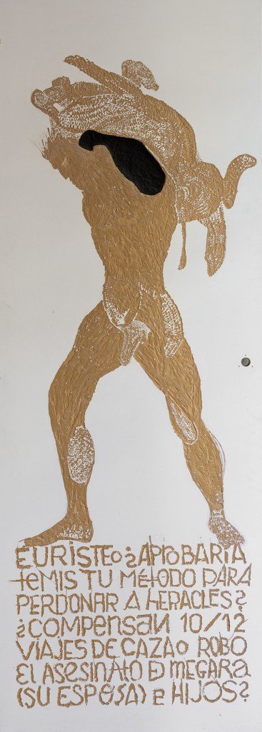 Recogí dos puertas, muy pesadas, que se resistieron a la pistola de calor y al bisturí. Eran macizas e iban cubiertas por una lámina blanca, probablemente de melanina, que era indiferente a esas manipulaciones. Para retirar partes de la inmaculada y lisa superficie blanca tuve que trabajar con gubias y herir, rayar, romper. El primer ejemplar es un dibujo de Heracles y el jabalí de Erimanto, donde cuestiono el rol del héroe, y del hombre en un mundo binario. Heracles es una mancha musculada hecha a grandes golpes, grabada en el DM de la puerta. La segunda puerta invierte el mecanismo y es el fondo tallado con delicadeza, con variedad de trazos y tramas, el que delimita la figura de Medea, a quien se interpela por sus acciones.