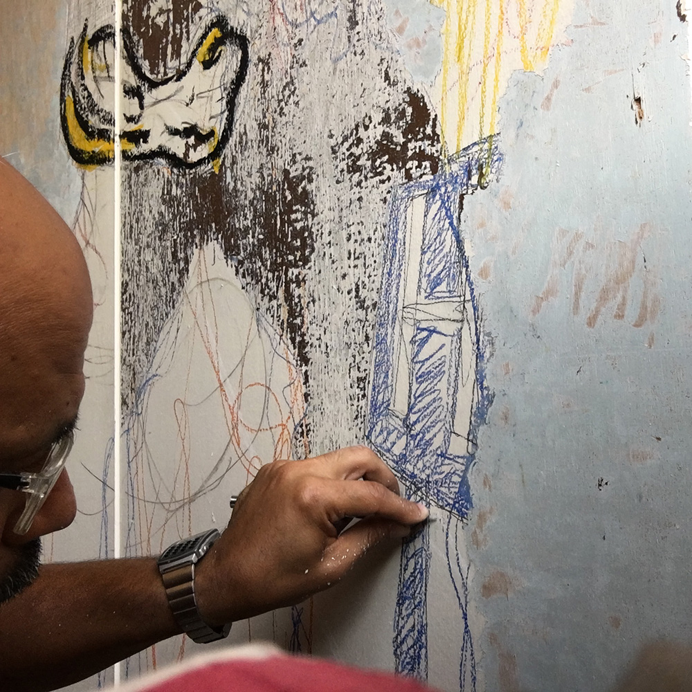 Al día siguiente de las elecciones el muy eficiente dispositivo de limpieza del ayuntamiento retiró todos los soportes de propaganda, impidiendo que continuase trabajando en esa serie. Pronto descubrí que las remodelaciones a apartamentos en mi vecindario me suplían otro tipo de soportes, puertas de madera en distintos estados de conservación, pero siempre viejas y repintadas. Como casi siempre eran blancas, al principio intenté decapar los fondos, dejando las pinturas/barnices blancos como imprimación para mis intervenciones, que eran ampliaciones de dibujos sobre las vigorosas esculturas de Degas o Rodin, versionadas como un Hourloupe de Dubuffet. En el camino descubrí que algunas de las puertas recogidas eran antiguas, e iban cubiertas por numerosas capas de pintura de distintos colores, por lo que abandoné la pistola de calor y utilicé hojillas para ir raspando cada capa (como había aprendido con Manuel Serrano, maestro restaurador mexicano) con paciencia, para usar esas tonalidades como mi propia paleta. Luego completé el conjunto con crayones o pinturas translúcidas, para siempre ser capaz de ver lo intrínseco de estas puertas.